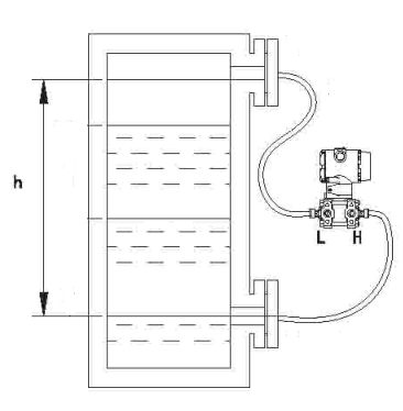 如圖所示,高壓室法蘭與容器低端法蘭相接,而低壓室法蘭安裝在與高壓室法蘭同一水平線上的大氣中。那么變送器量程為L(zhǎng)=H·ρ